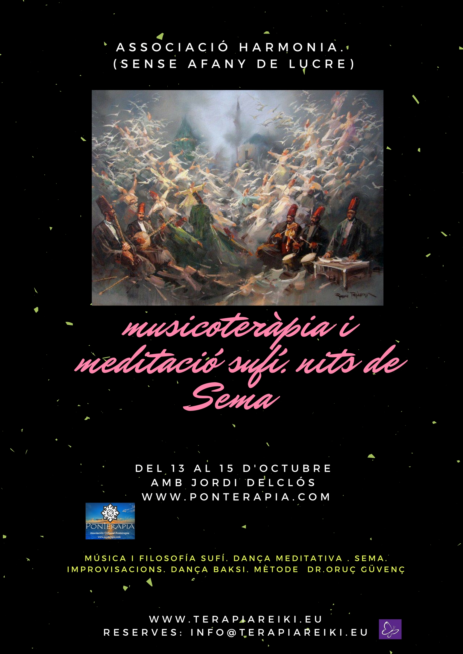 Es diu que el Sema (samâ) és la cura i l’aliment de l’ànima. El gran poeta místic sufí d’origen persa del S. XIII va instaurar a Konya (Anatolia-Turquia) aquesta bella dansa giratòria en la forma que la coneixem avuí, transmesa per les cofradies sufís fins als nostres dies. La dansa imita el moviment circular present a l’univers, i consisteix en girar meditativament amb música sufí en directe mentre es reciten mantres sufís. Es gira al voltant del cor, centre del nostre ésser i espai per a l’experiència espiritual. La música i la dansa obren així un pas cap el cor i permeten integrar aspectes difícils, alliberar-se de las pròpies lligadures mentals i connectar amb la nostra essència atemporal. No és necessita experiència prèvia.