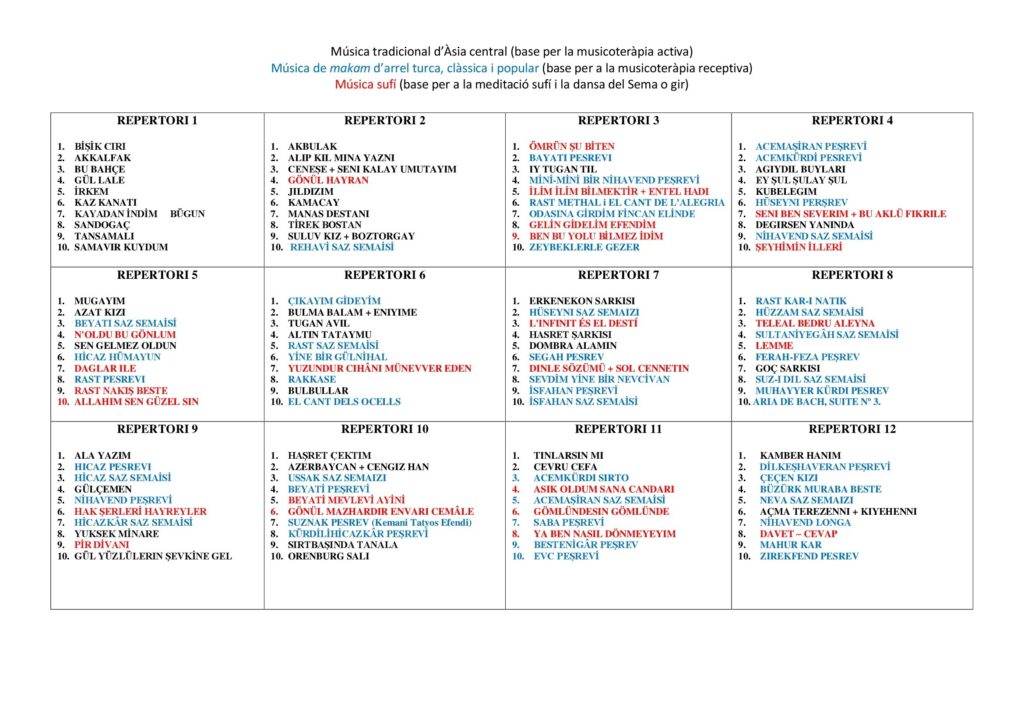 Totes les peces de música sufí que s’estudien són d’arrel turca i tenen molta antiguitat, inclús de varis centenars d’anys. Foren composades per alguns dels grans savis sufís passats i presents, i per això, tot i ser relativament senzilles, són profundament transformadores. La música sufí té la capacitat d’obrir un pas cap al cor, i ens ajuda així a desenvolupar la nostra essència espiritual més profunda. Quan aquesta part interior es desenvolupa té un efecte sanador sobre les altres parts: la ment, les emocions i el cos. Per això diem que la música sufí té també una clara dimensió terapèutica.